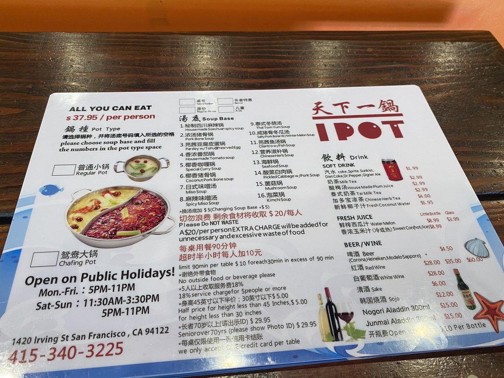 IPOT, located in San Francisco, offers a unique dining experience with its Asian Fusion, Chinese Hot Pot cuisine. Known for its delicious hot pot and Korean BBQ options, IPOT is a go-to spot for AYCE enthusiasts. The menu boasts a variety of meats like New Zealand Lamb, American Wagyu, and House special spicy beef, along with seafood, vegetables, and appetizers. Customers praise the rich and savory coconut pork bone broth, flavorful meats, and extensive sauce options. The ordering system, using QR codes and a 15-minute wait between rounds, adds convenience to the dining experience. Despite mixed reviews on ambiance and service speed, IPOT stands out for its diverse menu offerings and the ability to cater to both hot pot and BBQ cravings in one place. Whether dining with friends or family, IPOT promises a satisfying and filling meal with its array of choices and AYCE format.