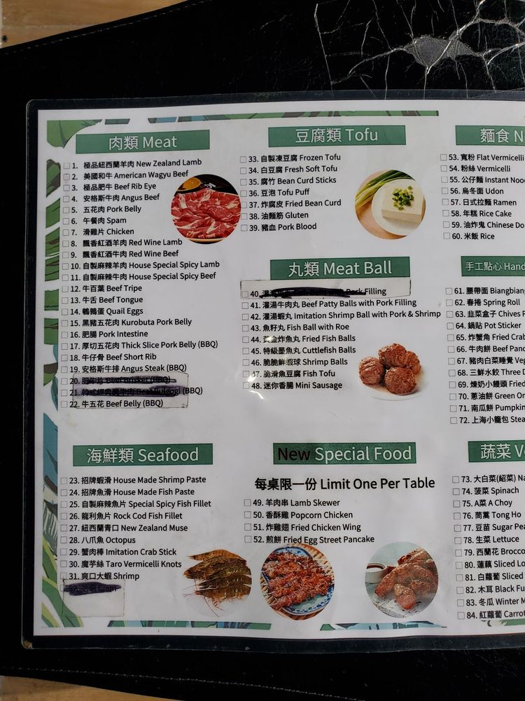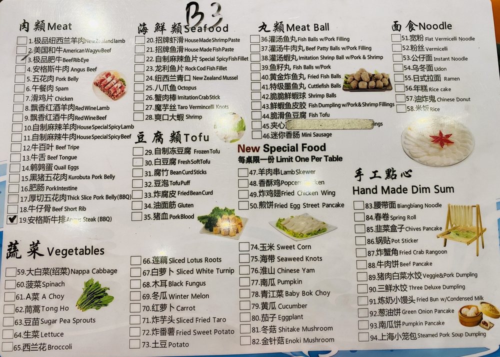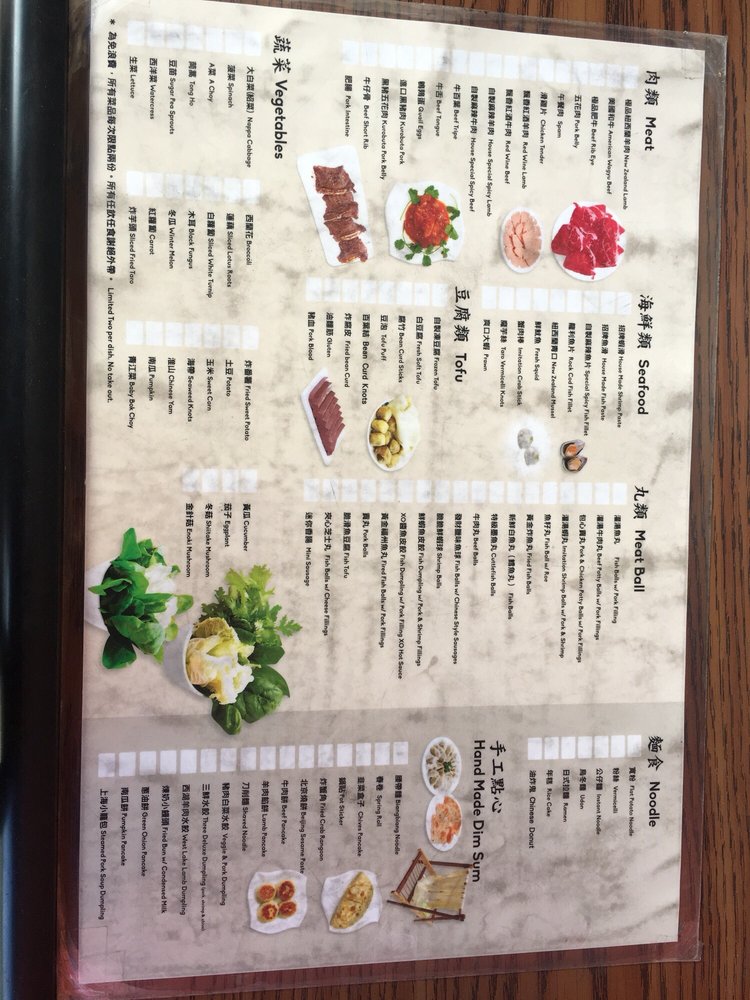 Shrimp, beef ribeye, tripe, spam, napa cabbage, bean curd sticks, winter melon, black fungus, sliced lotus roots, sliced potato.